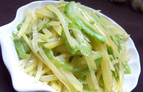 炒凉瓜土豆丝:将凉瓜和土豆切成细丝,加入蒜末、辣椒等调料,快速翻炒至熟即可。